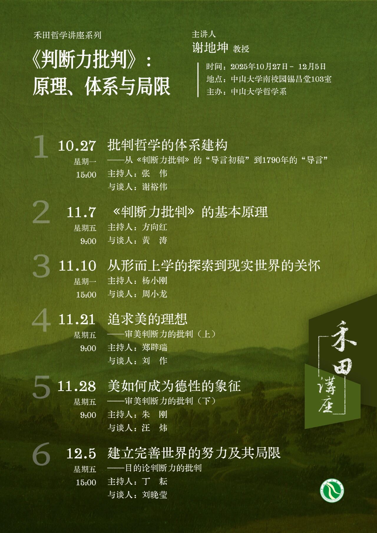 2025年10月27日至12月5日,中山大学禾田哲学系列讲座“《判断力批判》:原理、体系与局限”共六讲,在中山大学南校园锡昌堂103讲学厅举行,主讲人为中国人民大学哲学院教授、中山大学人文高等研究院特邀访问教授谢地坤。在系列讲座举行之际,由商务印书馆出版的“康德三大批判套装本”于10月出版发行。作为套装本中《判断力批判》新译本的译者,本系列讲座主讲人谢地坤基于其翻译经验与研究成果,对该书的基本概念、主要原理、体系结构及理论限度进行了深入探讨。