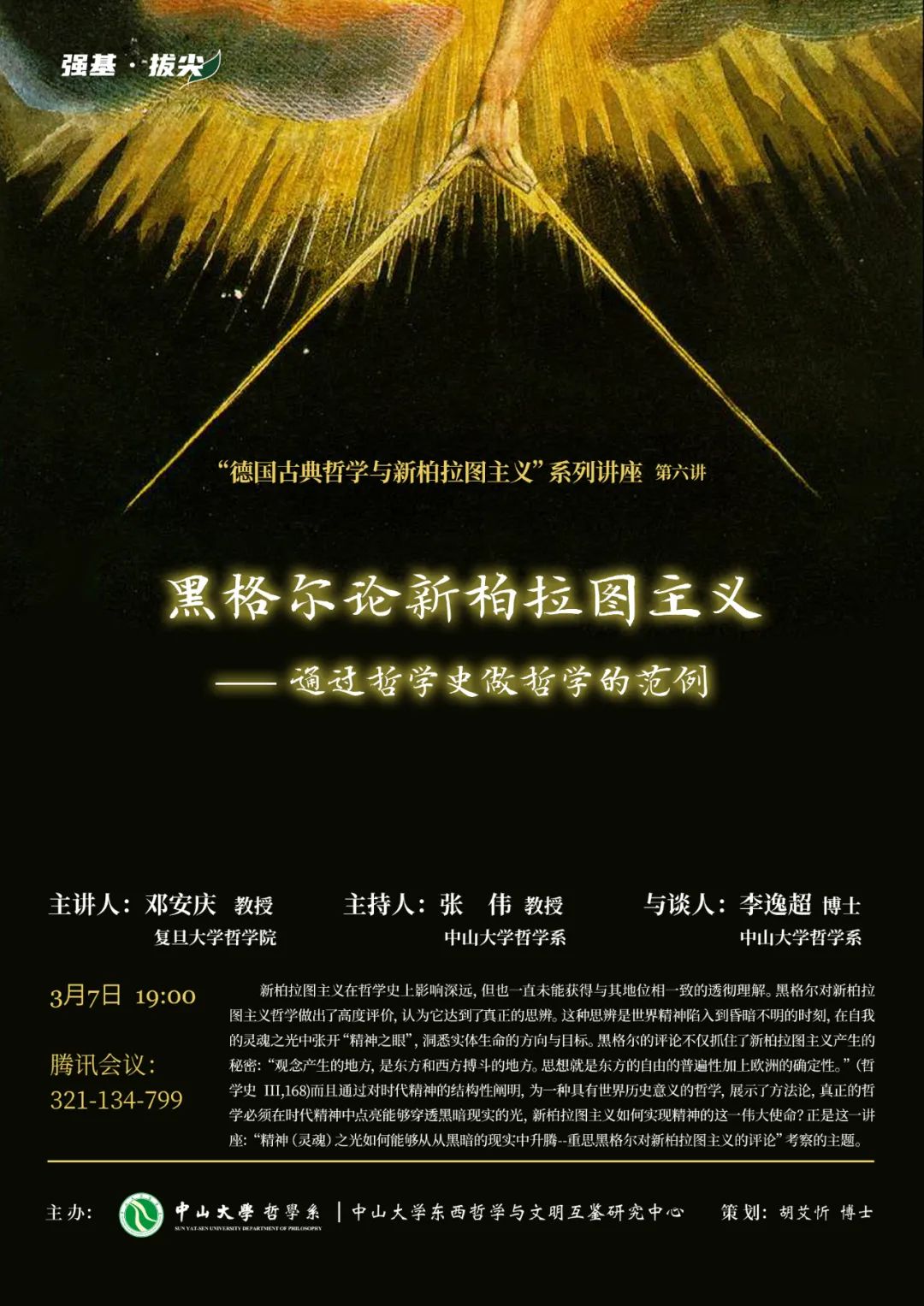 新柏拉图主义在哲学史上影响深远,但也一直未能获得与其地位相一致的透彻理解。黑格尔对新柏拉图主义哲学做出了高度评价,认为它达到了真正的思辨。这种思辨是世界精神陷入到昏暗不明的时刻,在自我的灵魂之光中张开“精神之眼”,洞悉实体生命的方向与目标。黑格尔的评论不仅抓住了新柏拉图主义产生的秘密:“观念产生的地方,是东方和西方搏斗的地方。思想就是东方的自由的普遍性加上欧洲的确定性。”(哲学史 III,168)而且通过对时代精神的结构性阐明,为一种具有世界历史意义的哲学,展示了方法论,真正的哲学必须在时代精神中点亮能够穿透黑暗现实的光,新柏拉图主义如何实现精神的这一伟大使命?正是这一讲座:“精神(灵魂)之光如何能够从从黑暗的现实中升腾--重思黑格尔对新柏拉图主义的评论”考察的主题。