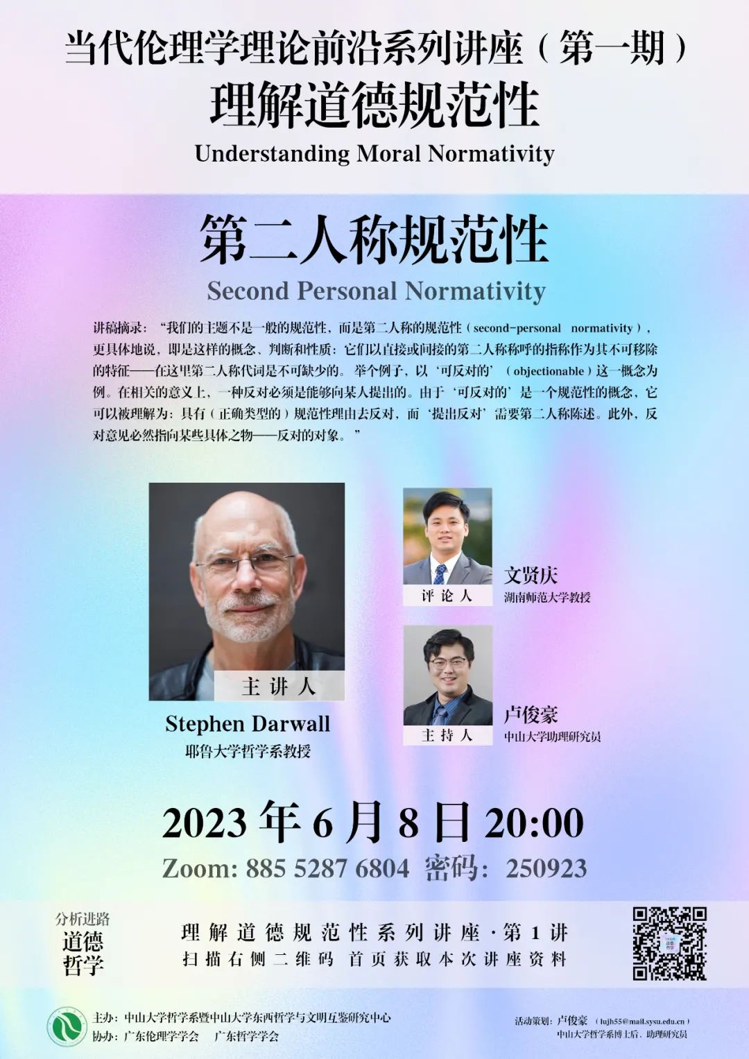 讲稿摘录:“我们的主题不是一般的规范性,而是第二人称的规范性(second-personal normativity)。更具体地说,即是这样的概念、判断和性质: 它们以直接或间接的第二人称称呼的指称作为其不可移除的特征一一在这里第二人称代词是不可缺少的。举个例子,以“可反对的’ (objectionable) 这一概念为例。在相关的意义上,一种反对必须是能够向某人提出的。由于“可反对的’是一个规范性的概念,它可以被理解为:具有(正确类型的)规范性理由去反对,而“提出反对’需要第二人称陈述。此外,反对意见必然指向某些具体之物一一反对的对象。