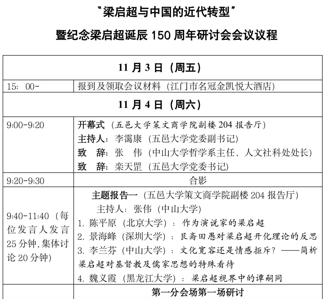 导航痕迹 中山大学哲学系 会议预告 | “梁启超与中国的近代转型”暨纪念梁启超诞辰150周年研讨会 会议预告 | “梁启超与中国的近代转型”暨纪念梁启超诞辰150周年研讨会 “梁启超与中国的近代转型”暨纪念梁启超诞辰150周年研讨会 发布日期:2023-11-02 主题 “梁启超与中国的近代转型”暨纪念梁启超诞辰150周年研讨会 活动时间 2023年11月03日 15:00 - 2023年11月06日 09:00