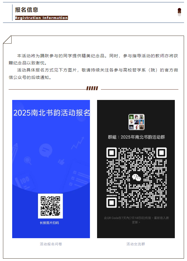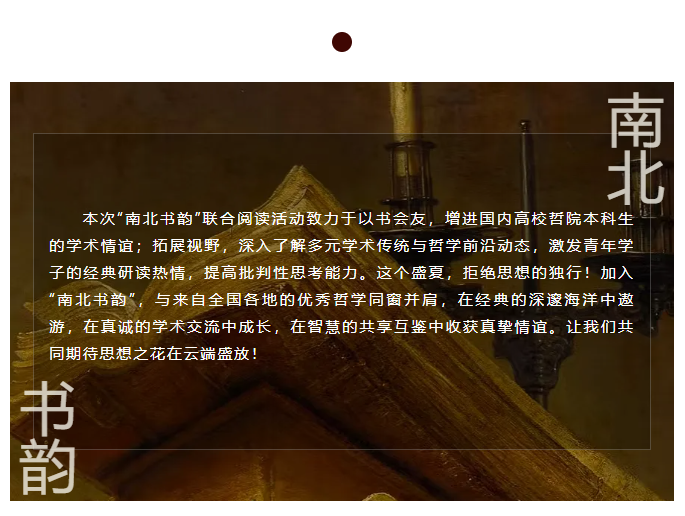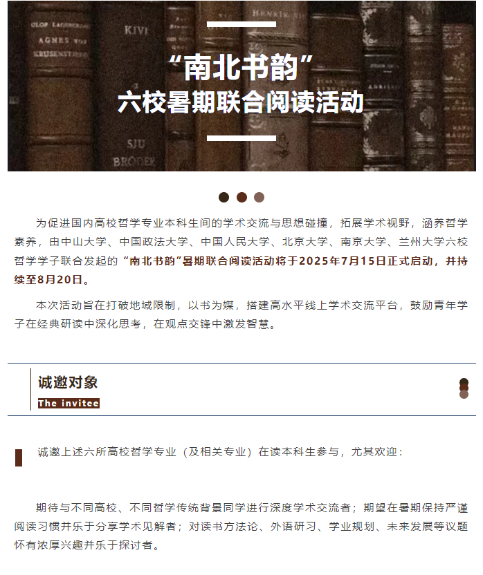 导航痕迹 中山大学哲学系 “南北书韵”2025年六校暑期联合阅读活动 “南北书韵”2025年六校暑期联合阅读活动 发布日期:2025-07-13 活动时间 2025年07月15日 00:00 - 2025年08月20日 23:59