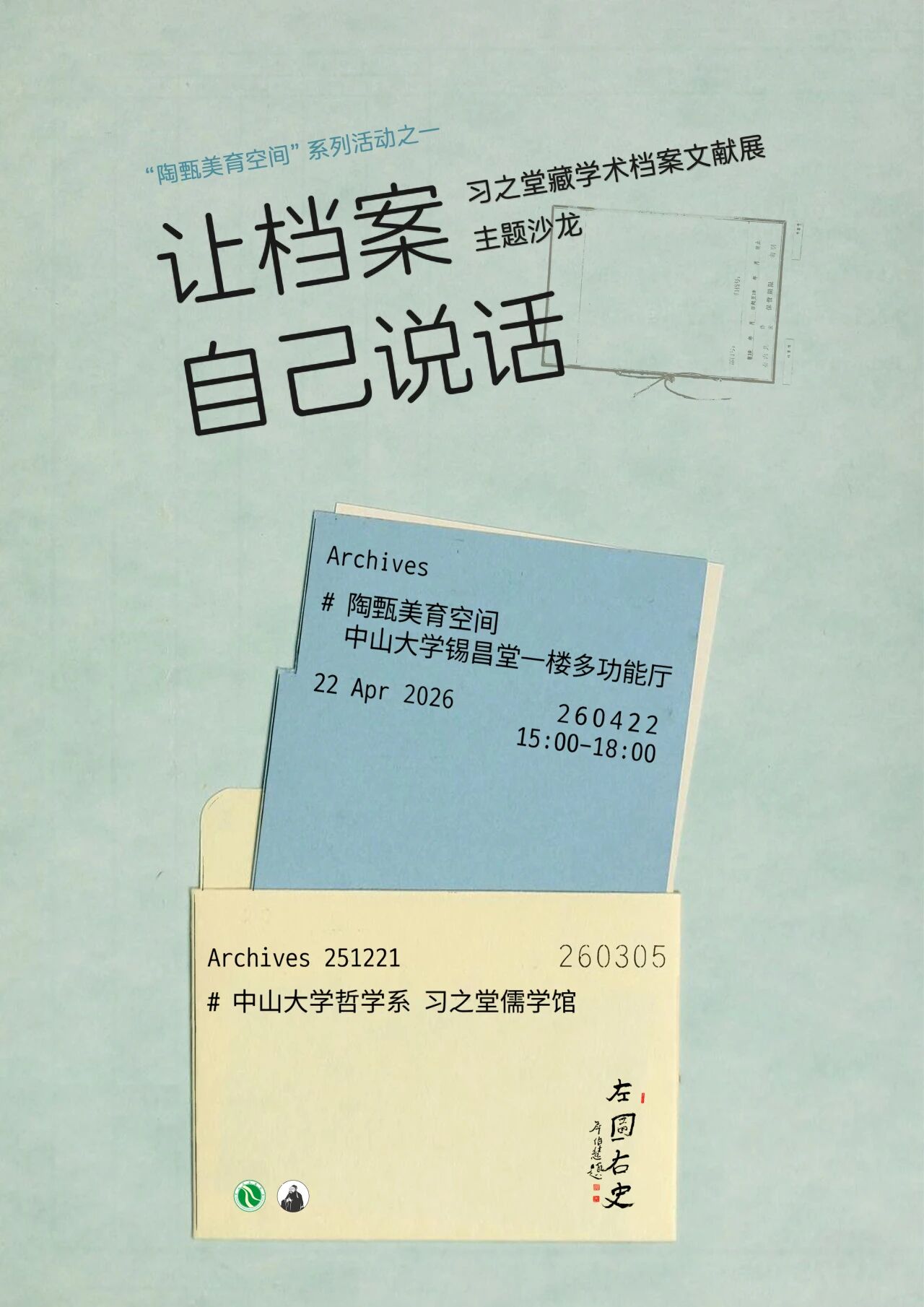 2025年12月21日,中山大学哲学系“陶甄美育空间”正式揭牌。该空间是哲学系五育并举的一个推进和尝试,是融合哲思与美育的重要载体。2026年3月5日,“左图右史——习之堂藏学术档案文献展”对外开放。此次展览关注一手档案,关注档案与学术思想的密切关联。我们认为,档案是未经“描述”的历史,堪称一个无穷的史料“解释库”。关注档案,或可催生新的学术或思想,法国哲学家福柯便是杰出代表。他主张“让档案自己说话”,运用知识考古学和谱系学的方法,揭示了档案所蕴藏的巨大思想力,在学界产生了广泛影响。为促进展览与学术的深度融合,兹特举办习之堂藏学术档案文献展主题沙龙,此乃“陶甄美育空间”之首次学术活动。